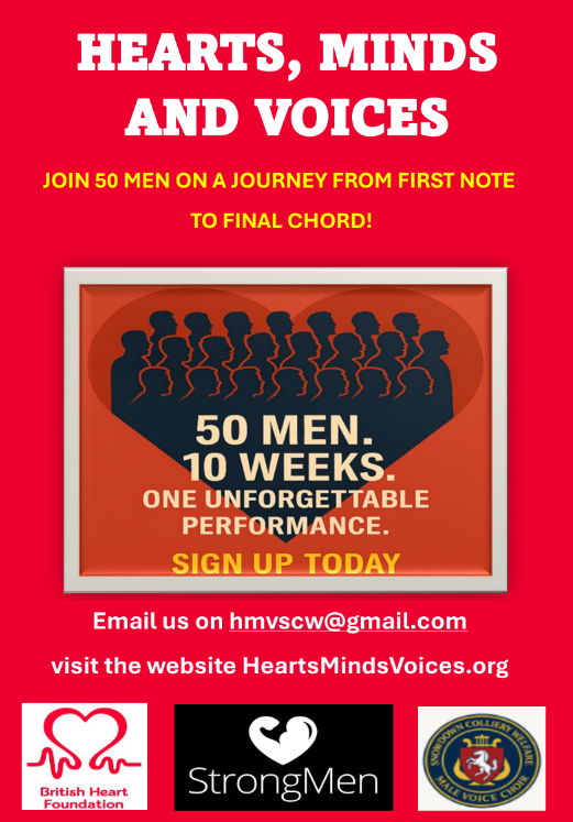 Welcome to Hearts, Minds and Voices. Join us singing with purpose – for our community, for our wellbeing and for the charities we proudly support: the British Heart Foundation and StrongMen. Whether you’re here to rediscover your voice, make new friends, or be part of something bigger than yourself, you